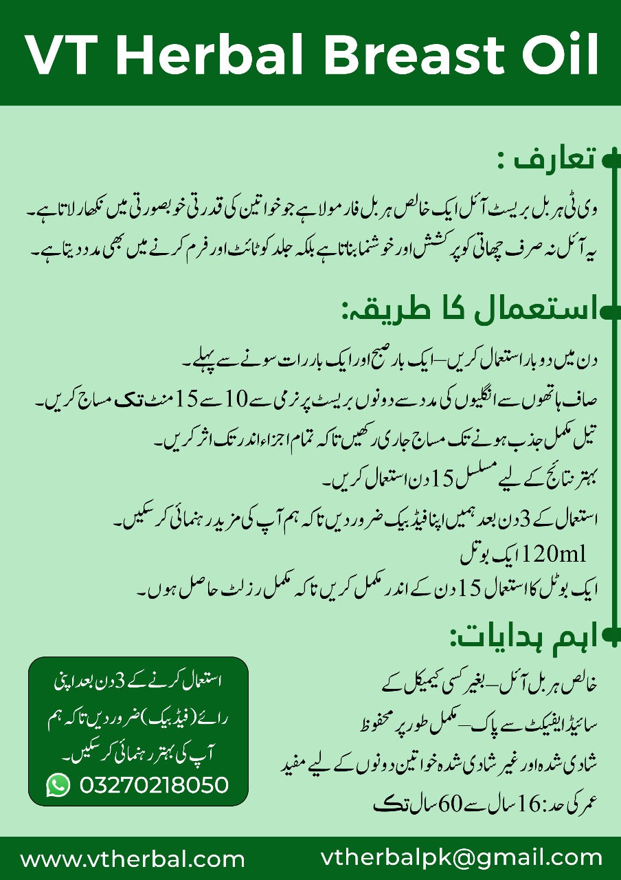 یہ آئل آپ کو مکمل، مضبوط اور خوبصورت بریسٹ حاصل کرنے میں مدد دیتا ہے، جس سے آپ کی خود اعتمادی میں اضافہ ہوتا ہے اور قدرتی خوبصورتی نکھر کر سامنے آتی ہے۔